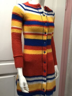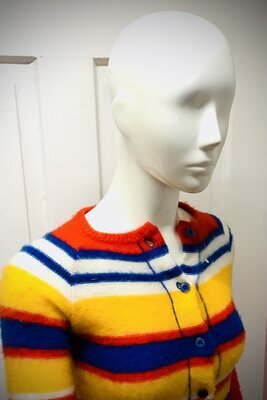 Mehrfarbige, taillierte, langarmige Strickweste mit Streifen in verschiedenen Breiten und Knopfverschluß. Bündchen am runden Halsausschnitt und den Ärmeln.