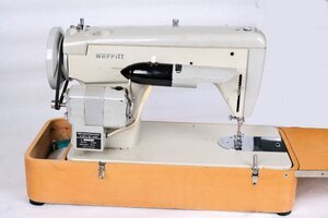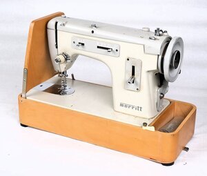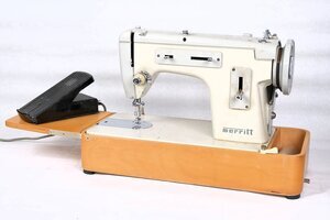Merritt ist eine Eigenmarke der Firma Singer, die bis zum Verkauf der Nähmaschinensparte (2004) bestand hatte. Die Merritt der Klasse 217 ist eine ZickZack-Haushaltsnähmaschine, Flachbett, mit angebautem Elektromotor. Trotz der bekannten Seriennummer M D767741 konnten wir das Herstellung Datum nicht genau ermitteln, dürfte aber Mitte der 1960er Jahre gewesen sein. Das Koffermodell wurde grau/beige lackiert und hat einen ca. 8 cm hohen Sockel aus Sperrholz. Darin eingearbeitet ist ein separates Fach zum Ablegen von Nähutensilien bzw. Zubehör. Der Nähtisch kann für den Betrieb um 20 cm verlängert werden, die für den Transport hochgeklappt wird. Auf der Vorderseite befinden sich die Bedienhebel für 8 verschiedene Zick Zack Muster sowie die Stichlängen Verstellung. (Bei dem Schwestermodell Merritt 216 fehlen diese Bedienhebel, da sie nur für Geradstich eingerichtet ist.) Auf der Rückseite befinden sich die Beleuchtung und der extern angebaute Elektromotor, der über einen Keilriemen die Maschine antreibt. Die Mechanik der Maschine ist noch in Ordnung, jedoch konnten wir die Elektronik nicht prüfen.