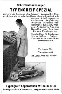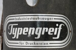 Bei dem "Staubsauger Typengreif" handelt es sich um einen Industriestaubsauger der speziell für die Reinigung von Setzkästen und zum Umsetzen von Typen von einem Setzkasten in einen anderen für mit dem Handsatz arbeitende Druckereien entwickelt wurde. Er unterscheidet sich von "normalen Staubsaugern" durch den Aufsatz: Über den Schlauch liegt ein permanenter Sog an. Wird der Aufsatz in das Fach eines Setzkastens mit Bleilettern gehalten, werden die Lettern angesogen und innerhalb des Gummibehälters gehalten. Ein Metallgitter verhindert, dass die Typen in den Schlauch gelangen. Durch eine Klappe oder ein Knopf am Aufsatz kann der Luftstrom nach hinten umgeleitet werden. Der Sog an der Vorderseite des Aufsatzes wird dadurch aufgehoben und die Lettern fallen wieder aus dem Aufsatz heraus. Im hinteren Bereich des Staubsaugers kann die Saugleistung in mehreren Stufen reguliert werden. Der Staubsauger ruht auf 2 Rädern und einem Ablagedorn.