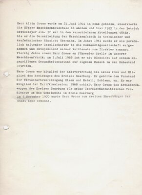 Fotografie entstand anlässlich der Überreichung des Kreisehrenwappens des Kreises Saarburg. Die Auszeichnung wurde 1968 vom damaligen Bürgermeiser der Stadt Konz, Michael Kutscheid, übergeben. Herr Kutscheid war vom 01.09.1957 bis 1975 Stadtbürgermeister in Konz und von 1971 bis 1990 Mitglied des rheinland-pfälzischen Landtages. Im Hintergrund der Aufnahme ist unter anderem Peter Zettelmeyer, der erste Ehrenbürger der Stadt Konz, zu erkennen. Neben der Aufnahme befindet sich eine kurze Zusammenfassung des Lebenslaufes des Herrn Groß im Besitz des Freilichtmuseums. Darin ist unter anderem ausgeführt, dass er 1925 seinen beruflichen Werdegang bei der Firma Zettelmeyer begonnen hat. 1941 wurde er als persönlich haftender Gesellschafter in die Kommanditgesellschaft aufgenommen und zum Direktor ernannt. Daneben wirkte er in verschiedenen Positionen kommunalpolitisch. Aus gesundheitlichen Gründen ist Herr Groß am 01.07.1965 in den Ruhestand eingetreten. Am 05.11.1970 wurde er zum zweiten Ehrenbürger der Stadt Konz ernannt.