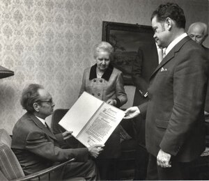 Fotografie entstand anlässlich der Überreichung des Kreisehrenwappens des Kreises Saarburg. Die Auszeichnung wurde 1968 vom damaligen Bürgermeiser der Stadt Konz, Michael Kutscheid, übergeben. Herr Kutscheid war vom 01.09.1957 bis 1975 Stadtbürgermeister in Konz und von 1971 bis 1990 Mitglied des rheinland-pfälzischen Landtages. Im Hintergrund der Aufnahme ist unter anderem Peter Zettelmeyer, der erste Ehrenbürger der Stadt Konz, zu erkennen. Neben der Aufnahme befindet sich eine kurze Zusammenfassung des Lebenslaufes des Herrn Groß im Besitz des Freilichtmuseums. Darin ist unter anderem ausgeführt, dass er 1925 seinen beruflichen Werdegang bei der Firma Zettelmeyer begonnen hat. 1941 wurde er als persönlich haftender Gesellschafter in die Kommanditgesellschaft aufgenommen und zum Direktor ernannt. Daneben wirkte er in verschiedenen Positionen kommunalpolitisch. Aus gesundheitlichen Gründen ist Herr Groß am 01.07.1965 in den Ruhestand eingetreten. Am 05.11.1970 wurde er zum zweiten Ehrenbürger der Stadt Konz ernannt.