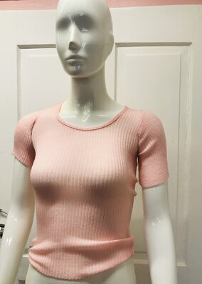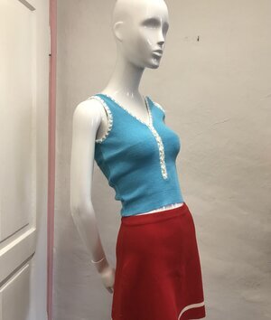 Kurze türkise Stricktops ( 2 Stück) mit tiefem rundem Ausschnitt im Rücken. V-Ausschnitt mit angedeuteter Knopfleiste mit kleinen Knöpfen. Ausschnitte mit weißem Garn umhäkelt.