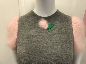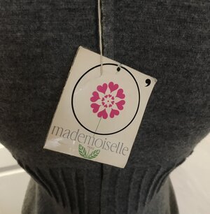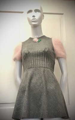 Kurzes graues Minikleid mit rundem Ausschnitt und kurzen Ärmeln. Hakenverschluß und Reißverschluß am Rücken. Die kurzen angesetzten Ärmel sind aus rosa Mohairwolle gehäkelt. Falten und markante Nähte im Taillenbereich, kleine Applikation aus Mohair am Halsausschnitt.