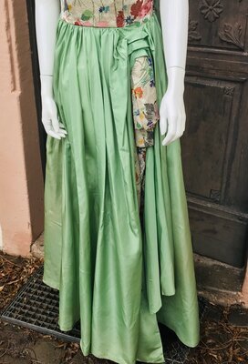 Weiter, bodenlanger Bahnenrock aus lindgrünem glänzendem Taftstoff mit langer Schluppe. Leicht in Falten gelegtes Oberteil mit kleinen angeschnittenen Schulterärmeln, -polstern und großem Schalkragen aus festem schimmerndem brokatähnlichem Stoff mit buntem Blumendruck.