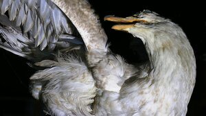 Ausgestopfte Möwe im Magazin. Von den Jahren im Magazin gezeichnet.