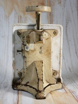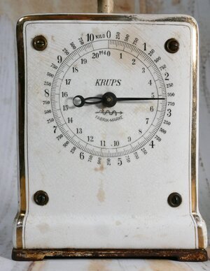 Federwaagen bestimmen ein Gewicht aufgrund der Verformung einer im Inneren der Waage befindliche Feder. Die Waagenfront aus Eisenblech mit aufgesetzter Skala bis 10 kg Gewicht wird von auf der Rückseite von einem zweiten Gusselement mit einem Standfuß abgestützt, das zugleich als Abdeckung für die Federwaagenmechanik dient. Eine Schraube an der Rückseite dient zur Kalibrierung der Waage. Die Aufschrift "KRUPS" in Kursivschrift befindet sich im oberen Teil und in der horizontalen Mitte der Waagenfront. Weiter unten befindet sich das Logo von Krups und die Aufschrift "Fabrik Marke". Die Waage besteht - von oben nach unten - aus einer abgängigen ovalen Kupferschale, einer Halterung in der letztere sicher liegt, der rechteckigen, mit einem Goldrand versehenen Fronscheibe mit einer runden Anzeige mit Zifferblatt und Zeiger. Das Ziffernblatt zeigt außen die Gewichte in Kilo und innen das Gewicht in Pfund.