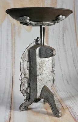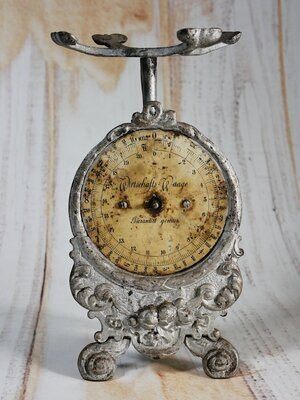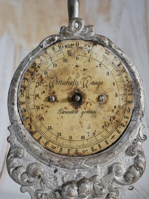 Wirtschaftswaagen sind entweder Federwaagen oder hydraulische Waagen. Die vorliegende Waage ist eine Federwaagen und bestimmt ein Gewicht aufgrund der Verformung einer im Inneren der Waage befindliche Feder. Federwaagen hatten den Nachteil, dass man das Gewicht nur auf 50g genau abwiegen kann und die Feder durch Gebrauch an Spannkraft verliert. Die Ruine einer oberschaligen Federwaage besteht aus einer ovalen Schale, einer Halterung in der letztere sicher liegt, der eigentlichen runden Anzeige mit Zifferblatt und Zeiger und drei Beinen. Das geschwungene Gehäuse ist mit Jugendstilelementen verziert. Die Waage besitzt die Aufschrift "Wirtschafts-Waage" in Zierschrift im oberen Teil und in der horizontalen Mitte des Ziffernblatts. Weiter unten befindet sich die Aufschrift "Garantiert Genau". Etwas innerhalb des runden Rands des Ziffernblatts befindet sich eine Skala - außen in Kilo von 0 bis 10 und etwas kleiner und weiter innen in Pfund von 0 bis 20. Die vorliegende Waage zeigt keine Angaben zum Hersteller und/oder zum Herstellungsjahr. Waagen mit der Aufschrift "Wirtschaftswaage" wurden von verschiedenen Herstellern produziert. Hergestellt wurden diese Waagen von etwa 1880 bis etwa 1930. Zwischen 1880 und 1887 wurden in Deutschland mindestens 7 Patente für Wirtschaftswaagen erteilt. Für eine Suche im depatisnet (der Datenbank des Deutschen Patent- und Markenamts) ist es wichtig hierbei mit der damaligen Schreibweise also "Wirthschaftswaagen" bzw. "Wirthschaftswaage" im Feld Titel zu suchen. Auf Grund der Schreibweise "Wirtschaftswaage" und nicht "Wirthschaftswaage" muss die Waage nach der Rechtschreibreform von 1901 hergestellt worden sein.