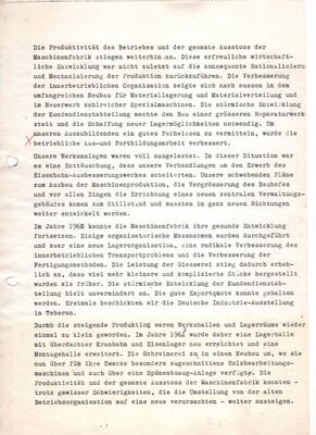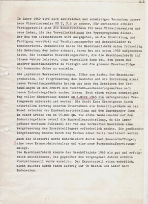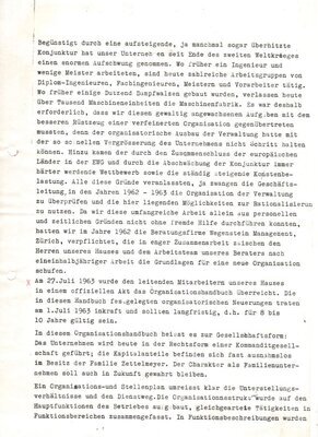 Konvolut von ca. 16 Schreibmaschinenseiten die wohl Teil einer größeren Firmanchronik sind. Leider gibt es keine Hinweise auf die seitliche Reihenfolge, so dass chronologische Zuordnung unklar ist. Es ist auch Möglich, dass es sich sogar um zwei unterschiedliche Berichte handelt. In den Unterlagen sind handschriftliche Korrekturen zu erkennen, jedoch gibt es keinerlei Hinweise auf den Urheber. Sicher ist nur, dass es sich um einen oder zwei interne Berichte der Firma Zettelmeyer handelt. Der Zustand einiger Seiten lässt die Vermutung zu, dass es ein Wasserschaden möglicherweise die Ursache für die Unvollständigkeit sein kann. Beschrieben wird auf den erhalten gebliebenen Seiten die teils stürmische Entwicklung des Unternehmens nach dem Krieg. Die Zwänge zur räumlichen Vergrößerung aber auch zu einer internen Restrukturierung. Dazu wurde externe Hilfe in Anspruch genommen. Am 27.07.1963 wurde danach den leitenden Mitarbeitern in einem offiziellen Akt ein Organisationsbuch überreicht. Die darin festgelegten Neuerungen traten zum 01.07.1963 in Kraft. Die am 27.07.1963 durchgeführte Veranstaltung zur Übergabe des Organisationsbuches wurde fotografisch festgehalten. (Foto) Des Weiteren wird über die vielfältigen Entwicklungen neuer Maschinen berichtet, den Ausbau des Reparaturbetriebes, den Export, Neugründungen von Niederlassungen und die Förderung des Personellen Nachwuchses. Aber auch von den wirtschaftlichen Schwierigkeiten in den 1960er Rezessionsjahren bis hin zur Entwicklung in den 1970er Jahren.