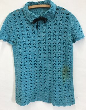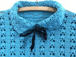 Vintage-Pullover, einfarbig in türkis mit kurzem Arm, Bubikragen und kleiner ,schwarzer Samtschleife. Gehäkeltes Ajour- Muster