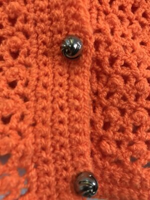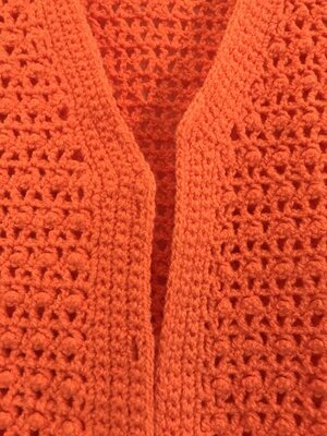 Ärmellose Vintage-Weste, einfarbig in neonorange, mit spitzem Ausschnitt und zwei kleinen Kugelknöpfen . Kleines gehäkeltes Muster.