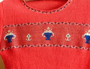 Strickpullover/ Langarm, Rundhals in hellrot mit blau- gelbem Phantasie-Muster an Brust und Halsausschnitt. Hoher gerippter Bund an Ärmel und Taille.