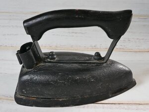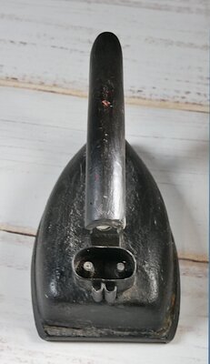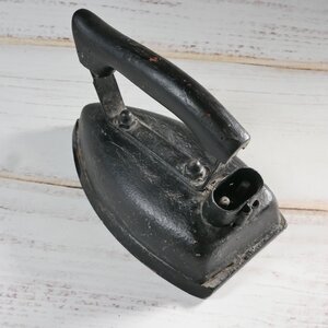 Elektrobügeleisen mit Bügeleisenstecker. Der geschwungene, schwarz lackierte Holzgriff war ursprüngliche rot lackiert und ist mit zwei Schrauben an einem Metallband befestigt. Das Metallband ist dann wieder vorne und hinten an der Kuppel mit zwei Hutmuttern befestigt. Die Kuppel besteht aus vernickeltem Eisenblech, die Sohle ist geschliffen und poliert. Hinter dem Bügel befindet sich die Steckdose für einen zweipoligen Bügeleisenstecker. Hinter der Steckdose befindet sich eine Halterung , die wohl zur Befestigung eines Bügels gedient haben. Seine Aufgabe war es beim Abstellen des Eisens dessen heiße Sohle vom Untergrund fernzuhalten. Das Bügeleisen besitzt weder einen Thermostat noch einen Schalter. Der Griff weist großflächig Farbabrieb auf. Der rote Holzgriff wurde wie das ganze andere Bügeleisen mit einem schwarzen Lack übermalt. Möglicherweise um es als Objekt in einer vintage-geprägten Umgebung cooler aussehen zu lassen. Keine Informationen zum Hersteller und zum Herstellungsjahr. Das Typenschild, das sich typischerweise unter dem Bügel befindet dürfte der Attacke mit der schwarzen Farbe zum Opfer gefallen sein.