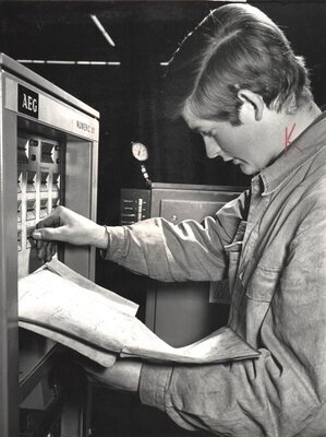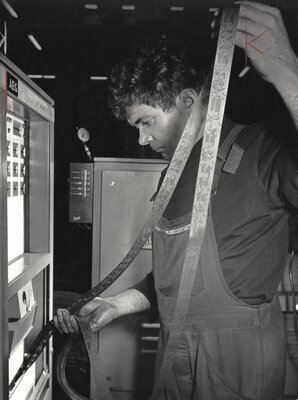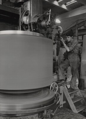 Sechs unterschiedliche Aufnahmen die im Jahre 1969 in der mechanischen Werkstatt der Firma Zettelmeyer entstanden sind. Man sieht jeweils Arbeiter an Dreh-, Bohr- und Fräsmaschinen. Eine mechanische Werkstatt ist ein Arbeitsbereich, in welchem Werkstücke mit verschiedenen Techniken bearbeitet werden. Drehmaschinen werden in der Regel zur Herstellung von runden Bauteilen verwendet. Bohrwerke benötigt man zur Entfernung von Materialien im Inneren eines Gegenstandes. Mittels Fräsmaschinen können Vertiefungen oder Profile in ein Werkstück eingearbeitet und Kanten abgeschrägt werden. Auf der ersten Aufnahme sind mehrere Arbeiter zu sehen, die an Drehmaschinen beschäftigt sind. Die Bilder zwei und drei betreffen Arbeiten einer nummerischen Drehmaschine. Eine nummerische Drehmaschine bearbeitet ein Werkstück selbstständig entsprechend den zuvor erhaltenen Eingaben. Zum einen ist ein Mann mit der Einstellung der Elektrik beschäftigt und das andere Foto hat das Einlegen eines Lochstreifens in den Leser der nummerischen Drehmaschine festgehalten. Die weiteren Bilder zeigen Bohrwerker, die eine horizontal arbeitende Bohrmaschine bedienen, und einen sogenannten Karusseldreher. Ein Karusseldreher bedient eine Drehmaschine, die über eine senkrecht arbeitende Arbeitsspindel verfügt. Bei einer solchen Maschine wird das Werkstück auf einer flachen Scheibe eingespannt. Es erfolgt dann eine seitliche Bearbeitung des Gegenstandes.