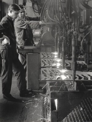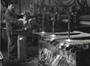 Zwei ca. DIN A5 große Aufnahmen, die einen Gesellen und einen sogenannten Anlernling beim Bedienen einer Mehrfach-Brennmaschine zeigen. Die Bilder stammen aus dem Jahre 1969. Auf einer in der rechten Bildhälfte abgebildeten Arbeitsfläche liegen drei größere Blechplatten. Daraus werden mittels von oben herangeführter Brennwerkzeuge parallel verschiedene Bauteile herausgeschnitten. Der durch den Schneideprozess entstehende Funkenflug wurde in Richtung der darunter befindlichen Metallroste abgeleitet. Der Geselle steht seitlich neben dem Arbeitsfeld vor verschiedenen Bedienelementen der Maschine. An den Brennwerkzeugen sind Drehknöpfe angebracht. Damit konnte die Menge der jeweils zugeführten Brennstoffe reguliert werden. Ein Brennschneider besteht aus einer Düse, durch die Sauerstoff geleitet wird. Mittels einer zweiten Düse, die um die Sauerstoffdüse herum angebracht ist, wird ein Sauerstoff-Brenngas-Gemisch erzeugt. Dieses wird dann am Ausgang der Düsen entzündet und zum Schneiden der Werkstücke verwendet.