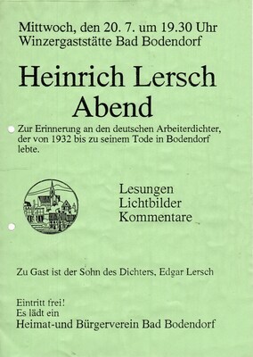 Heinrich Lersch ließ sich von einem befreundeten Architekten eine Hütte planen, die im Tal von Bodendorf/Ahr zum Reichsberg gebaut wurde. Die diente Lersch als Rückzugsort, an dem er ungestört schreiben konnte. Im Dorf war die Hütte als "Dichterklause" bekannt. Die Hütte wurde von der französischen Besatzungstruppen 1945 abgerissen.