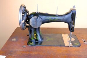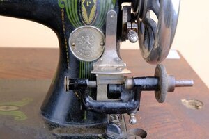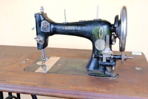Bereits 1855 gründete Clemensmüller seine erste Nähmaschinenfabrik in Dresden. Unser Modell „Veritas“ mit der Seriennummer 2.566.679 dürfte um 1910 hergestellt worden sein. Die Flachbettmaschine wird über einen Tretmechanismus und Lederriemen angetrieben. Ausgestattet war das Modell mit einem Schwingschiffchen, das sehr zuverlässig arbeitete und eine saubere Naht hinterließ. Der Aufspulapparat sitzt an der Vorderseite und ist noch funktionsfähig. Genäht werden konnte nur Vorwärts, wobei die Stichlänge eingestellt werden konnte. Wie um diese Zeit üblich ist die Maschine schwarz lackiert, trägt auf der Vorderseite den Modellnamen Veritas in goldfarbenen Buchstaben. Weitere Verzierungen auf dem Maschinenarm und der Grundplatte, sind in den Farben Grün, Gelb und Gold gehalten. Zusätzlich ist eine Metallplakette, mit Namen und Logo des Herstellers, auf der Vorderseite angebracht. An der Vorderkante des hölzernen Nähtisches ist, als Intarsien Arbeit, ein 50 cm Metermaß eingearbeitet. Die Abdeckhaube ist ebenfalls aus Holz und ist führ in großen Buchstaben den Namen „VERITAS“ Ursprünglich war unterhalb des Tisches eine Schblade angbracht, die aber nicht mehr vorhanden ist. Auch der Unterbau, aus Gusseisen, trägt auf beiden Seiten den Modellnamen Veritas als Abziehbild."
