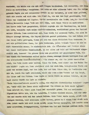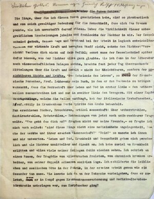 1930 erschien das Buch "Hammerschläge", einen Roman, in dem Heinrich Lersch über Menschen und Maschinen aus der Sicht eines Kesselschmied schrieb. Den Bogen spannend über medizinische Erfolge in der Krebsforschung und einer Krankenvorsorge, die der Medizinal Bürokratie unterlegen war erzählt er von einem Bericht den er über todbringende Erd- und Aetherstrahlen laß und so zu einem Heilkundigen kam, der ihm Linderung bei seinem an der Front im 1. Weltkrieg erlittenen Lungenleiden brachte. Die Überschrift, von Heinrich Lersch mit Bleistift über die ursprüngliche, durchgestrichene, Überschrift geschrieben zum Text lautet: "Die Ruten Gottes" Im Text finden sich noch einige schriftliche Änderungen. Die vorliegenden sechs Blätter sind offenbar ein Entwurf und wurden noch in Reinschrift übertragen.