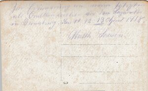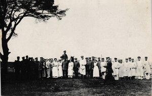 Schwarzweißfotografie bei der Matthias Leisen vor einer Sanitätskompanie den Umgang mit einer Wünschelrute demonstriert. Auf dem Fotos sind neben Soldaten in Uniform weißgekleidete Krankenschwestern und Pfleger zu sehen. Die Vorführung wurde an den Tagen 11., 12. und 13. 04. 1918 wiederholt.