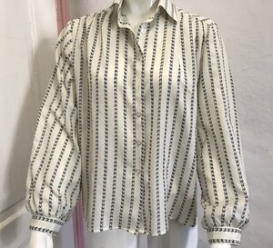 Elegante, klassische Damen-Langarmbluse in elfenbein mit blauem senkrechtem Streifenmuster. Weit geschnitten mit Reverskragen und weiten Ärmeln.