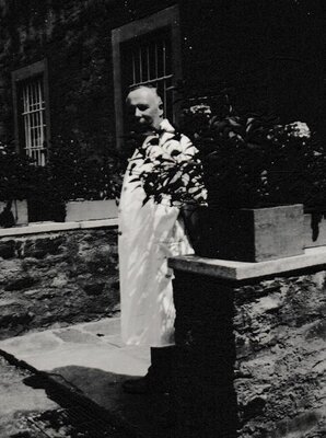 Nikolaus Leisen im weißen Behandlungskittel im Burghof