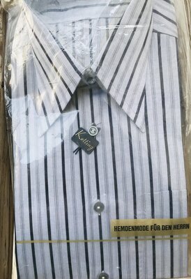 Herrenoberhemd mit längerem Kent- Kragen, gerader Schnitt mit langen Ärmeln und kleiner Brusttasche. Grau mit schwarzen Längsstreifen.