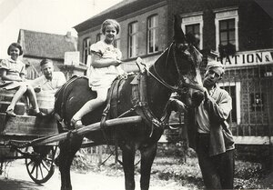 Schwarzweißfotografie der Hofeinfahrt zur Burg um 1930. Aufgenommen vom (ehemaligen) Winzerverein aus. Rechts das erste flache Gebäude war die Remise. Im Burghof steht ein weit ausladender Laubbaum und dahinter ist das Herrnhaus zu erkennen. Die flachen Gebäude links vom Herrnhaus abgehend wurde als Bäderhaus des Matthias-Bades genutzt. Vorn links im Bild stehen die Werbe- und Hinweistafeln zum Matthias-Bad.