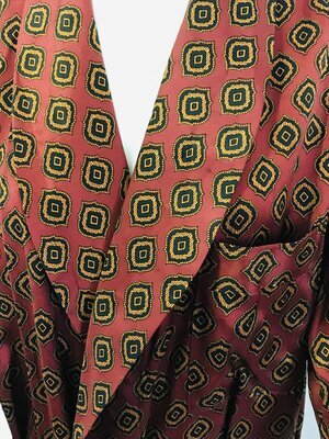 Eleganter, knielanger Herren-Morgenmantel/ Hausmantel mit Paisleymuster in Rost-Orange im Vintage- Stil. Lange, gerade Ärmel mit breiten Umschlagmanschetten, Schalkragen, Bindegürtel sowie einer Brusttasche und zwei tiefen Seitentaschen.