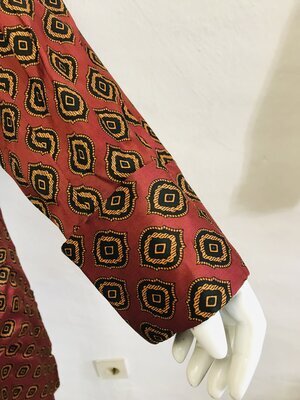 Eleganter, knielanger Herren-Morgenmantel/ Hausmantel mit Paisleymuster in Rost-Orange im Vintage- Stil. Lange, gerade Ärmel mit breiten Umschlagmanschetten, Schalkragen, Bindegürtel sowie einer Brusttasche und zwei tiefen Seitentaschen.