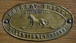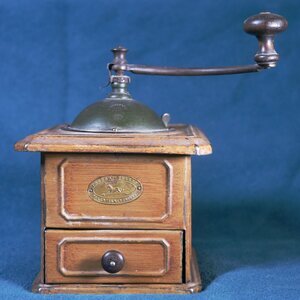 Eine Kaffeemühle dient dazu Kaffeebohnen zu zerkleinern. Der quadratische Corpus der Schoßmühle der Firma Peugeot ist aus Eisenblech gefertigt. Die oberstellige Kaffeemühle mit Kuppel ist braun bemalt um den Eindruck eines Holzgehäuses zu erzeugen. Die Mühle besitzt eine relativ flache Kuppel über dem in das Gehäuse eingelassenen Trichter. Der Deckel der Kuppel kann nach hinten geöffnet werden. Die Bohnen werden in einem Kegelmahlwerk gemahlen und in der darunter liegenden Schublade aufgefangen. Messingplakette auf der Frontseite mit dem Firmenlogo mit Löwen und Pfeil in der Mitte. Darüber die Aufschriften PEUGEOT FRÉRES - MODELE DEPOSEÉ und darunter VALENTIGNEY (DOUES). Auf der Vorderseite der Kuppel befindet sich ein eingestempeltes Löwenlogo und darüber zwei nicht mehr lesbare Inschriften.