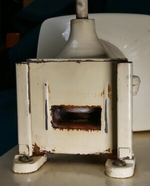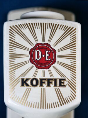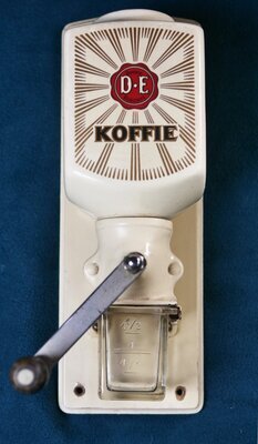 Die Geschichte des Unternehmens Douwe Egberts geht auf ein 1753 gegründetes Einzelhandelsgeschäft im friesischen Ort Joure zurück. 1978 wurde das Unternehmen von dem amerikanischen Konsummittelkonzern Sara Lee übernommen. Nach weiteren Umstrukturierungen und Übernahmen ist es heute (2024) seit 2015 Teil von Jacobs Douwe Egberts (JDE) und eine von rund 30 Marken des Unternehmens. Die Mühle wurde - da über eine Kaffeemühlenproduktion von Douwe Egberts nicht bekannt ist - wohl durch einen anderen Hersteller für Douwe Egberts produziert. Nach einer unsicheren Quelle (Angebot im Web) von Zassenhaus. Kaffeemühle mit Wandhalterung aus weiß glasierter Keramik mit farbig gestalteter Frontseite. Die Bohnen wurden nach Abnahme des abgängigen Holzdeckels in einen Keramikbehälter geschüttet. Die Oberfläche des Keramikbehälters ist künstlerisch gestaltet. Etwa in seiner Mitte befindet sich in einem Strahlenkranz und auf einem aufgedruckten Siegel groß und in weißer Schrift das Logo D * E, in deutlich kleinerer und schwarzer Schrift über dem Logo der Schriftzug Douwe und unter dem Logo der Schriftzug Egberts. Unter dem Keramikbehälter befindet sich das unterstellige Kegelmahlwerk. Mit einem Flügelrad hinter dem Mahlwerk kann die Feinheit eingestellt werden. Dreht man an der Kurbel werden die über dem Mahlwerk gelagerten Bohnen gemahlen und das Kaffeepulver wird in dem unter dem Mahlwerk befindlichen gläsernen Auffangbehälter aufgefangen.