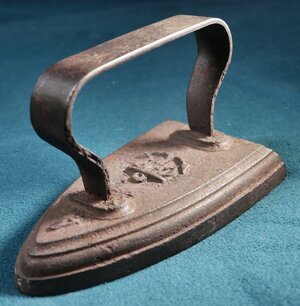 Das Flachbügeleisen besitzt einen angegossenen Bügelgriff in rheinischer Form und einen kanellierten Rand. Zwischen den Bügelstützen in der Mitte des Eisens befindet sich als Halbrelief die Abbildung eines Schiffsankers mit den Initialen C und F. Links oben von der hinteren Bügelstütze befindet sich eine 4 als Größénangabe. Interessant ist der Vergleich mit dem Bügeleisen Inventarnummer HR 424, das zu einer Zeit entstanden sein dürfte, als Lothringen (wieder) zu Frankreich gehörte. Das Flachbügeleisen gehört zu den massiven Volleisen, die aus Eisen oder Stahl geschmiedet oder gegossen und bereits ab dem 18. Jh. hergestellt wurden. Auf Grund seines geringen Gewichts und seiner flachen Sohle, die nahezu mühelos über die vorher mit Wasser besprengte Wäsche gleitet, erfreute es sich noch weit bis ins 20. Jahrhundert hinein großer Beliebtheit. Das Erhitzen auf dem Kohleofen oder in einer offenen Feuerstelle wie dem Kaminfeuer erforderte jedoch verschiedene Vorsichtsmaßnahmen, um die Bügelwäsche nicht zu beschmutzen oder sich am fest verbundenen Metallgriff zu verbrennen. Viele Büglerinnen wischten daher nach dem Erhitzen des Eisens mit einem Tuch, das sie an ihrer Schürze befestigt hatten, über die Bügelsohle. Als Hitzeschutz wurde oftmals ein dicker Handschuh oder ein Lappen, der um den Griff gewickelt wurde, verwendet.