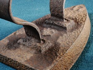 Sehr einfaches Flachbügeleisen mit angeschweißtem Bügel im rheinischen Stil und sehr rauer Oberfläche. An der Spitze befindet sich die Zahl 17. Auf der Oberfläche unter dem Bügel ist eine nicht identifizierbare Gussmarke. Das ganze Bügeleisen ist von Flugrost überzogen. Die gerundete Bügelsohle zeichnet es als Glanzbügeleisen zum Bügeln von hohen Krägen, Batistblusen etc. aus. Es handelt sich um ein einfaches Flacheisen, das auf der Herdplatte oder an einem Bügeleisenofen erhitzt werden musste. Das leichte Flachbügeleisen gehört zu den massiven Volleisen, die aus Eisen oder Stahlgeschmiedet oder gegossen und bereits ab dem 18. Jh. hergestellt wurden. Auf Grund seines geringen Gewichts und seiner flachen Sohle, die nahezu mühelos über die vorher mit Wasser besprengte Wäsche gleitet, erfreute es sich noch weit bis ins 20. Jahrhundert hinein großer Beliebtheit. Das Erhitzen auf dem Kohleofen oder in einer offenen Feuerstelle wie dem Kaminfeuer erforderte jedoch verschiedene Vorsichtsmaßnahmen, um die Bügelwäsche nicht zu beschmutzen oder sich am fest verbundenen Metallgriff zu verbrennen. Viele Büglerinnen wischten daher nach dem Erhitzen des Eisens mit einem Tuch, das sie an ihrer Schürze befestigt hatten, über die Bügelsohle. Als Hitzeschutz wurde oftmals ein dicker Handschuh oder ein Lappen, der um den Griff gewickelt wurde, verwendet.