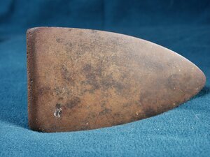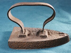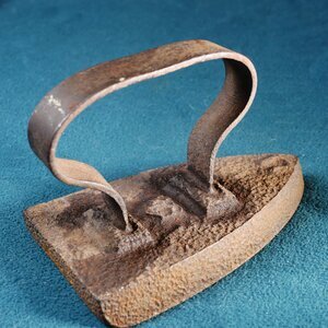 Sehr einfaches Flachbügeleisen mit angeschweißtem Bügel im rheinischen Stil und sehr rauer Oberfläche. An der Spitze befindet sich die Zahl 17. Auf der Oberfläche unter dem Bügel ist eine nicht identifizierbare Gussmarke. Das ganze Bügeleisen ist von Flugrost überzogen. Die gerundete Bügelsohle zeichnet es als Glanzbügeleisen zum Bügeln von hohen Krägen, Batistblusen etc. aus. Es handelt sich um ein einfaches Flacheisen, das auf der Herdplatte oder an einem Bügeleisenofen erhitzt werden musste. Das leichte Flachbügeleisen gehört zu den massiven Volleisen, die aus Eisen oder Stahlgeschmiedet oder gegossen und bereits ab dem 18. Jh. hergestellt wurden. Auf Grund seines geringen Gewichts und seiner flachen Sohle, die nahezu mühelos über die vorher mit Wasser besprengte Wäsche gleitet, erfreute es sich noch weit bis ins 20. Jahrhundert hinein großer Beliebtheit. Das Erhitzen auf dem Kohleofen oder in einer offenen Feuerstelle wie dem Kaminfeuer erforderte jedoch verschiedene Vorsichtsmaßnahmen, um die Bügelwäsche nicht zu beschmutzen oder sich am fest verbundenen Metallgriff zu verbrennen. Viele Büglerinnen wischten daher nach dem Erhitzen des Eisens mit einem Tuch, das sie an ihrer Schürze befestigt hatten, über die Bügelsohle. Als Hitzeschutz wurde oftmals ein dicker Handschuh oder ein Lappen, der um den Griff gewickelt wurde, verwendet.