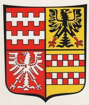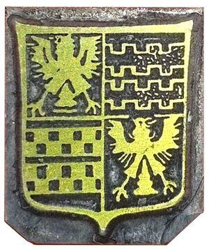 Druckplatte für den Bleisatzdruck des Bad Bodendorfer Wappen. Die Druckplatte ist spiegelverkehrt zum Original hergestellt und wurde zusammen mit dem Fließtext in einer Druckform zusammengesetzt.
