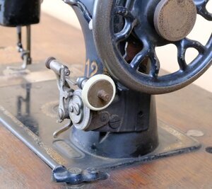 Wie alle Maschinen aus dieser Zeit ist auch unser Modell schwarz lackiert und mit 1cm breiten, umlaufenden, goldfarbenen Musterstreifen auf der Bodenplatte verziert. Auf der Vorder- und Rückseite des Maschinenarms wurde der Firmenname „Pfaff“ bereits beim Guss des Gehäuses eingearbeitet. Das Pfaff Modell 12 ist eine Bogenschiff-Geradestich-, Flachbettnähmaschine mit Tretantrieb. Die Seriennummer 1.473.446 ist dem Baujahr 1926 zu zuordnen. Das Tischmodell hat eine gusseisernem Tretmechanik, die in einen hölzernen Arbeitstisch integriert ist. Unterhalb der Tischplatte befindet sich eine Schublade zur Aufbewahrung von Nähutensilien. Bei unserer Zweifadenmaschine wurde der Aufspulapparat -zum Aufspulen des Unterfadens- rechts vorn, am Maschinenständer angebracht. Oberhalb davon ist der Hebel zur Veränderung der Stichlängen angeordnet.