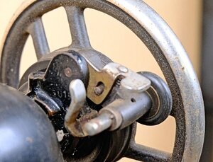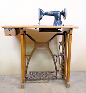 Das Pfaff "Modell 30" ist eine Geradestich-, Flachbettnähmaschine mit Tretantrieb und Zentralschiffchen. Die Seriennummer 3.892.437 kann dem Baujahr 1948 zu geordnet werden. Das Tischmodell hat eine gusseiserne Tretmechanik, die in einen hölzernen Arbeitstisch integriert ist. Unterhalb der Tischplatte befindet sich eine Schublade zur Aufbewahrung von Nähutensilien. An der Schublade ist ein Metallplättchen befestigt, dass uns den damaligen Verkäufer verrät. Es war die Firma M. P. Henn aus Trier, Viehmarkt 17 Wie alle Maschinen aus dieser Zeit ist auch unser Modell schwarz lackiert und mit 1cm breiten, umlaufenden, goldfarbenen Musterstreifen auf der Bodenplatte verziert. Auf der Vorder- und Rückseite des Maschinenarms ist der Firmenname als Abziehbild aufgebracht. Zusätzlich, auf dem Ständer, noch die Typenbezeichnung "30/31". Der Aufspulapparat, zum Aufspulen des Unterfadens, ist direkt oben am Handrad angebracht. Das Modell 30 war beim Verbraucher sehr beliebt, die Maschine hat eine leichtgängige Mechanik aus Metall und glänzt durch eine einfache Bedienung.