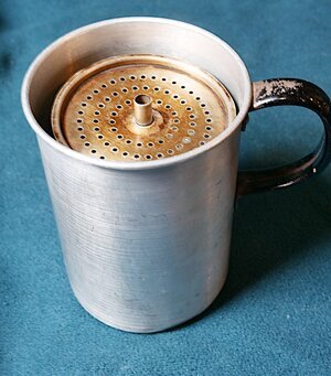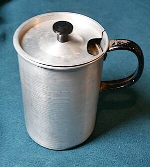 Perkolator (auch Percolator; vom lateinischen 'percolare', übersetzt: 'filtern'), umgangssprachlich auch Dröppelminna genannt in einer Größe für etwa 5 Kaffeetassen. Der Perkulator besteht aus einem zylindrischen Gefäß mit einem abnehmbaren Deckel mit schwarzem Knauf. In diesem befindet sich lose ein Steigrohr mit einer unten liegenden Auffangkalotte und oben einem zwischen zwei Sieben befindlichem Behälter für den gemahlenen Kaffee. Leider sind keine Informationen zum Hersteller und zum Produktionszeitpunkt vorhanden. Wird das Gerät von unten z.B. von einem Gasbrenner erhitzt, so wird das Wasser in der Heizmulde erhitzt. Durch eine am unteren Ende des Steigrohrs angebrachte Auffangkalotte werden Dampfblasen aufgefangen. Wie bei einer Mammutpumpte steigen die Wasserdampfblasen zusammen mit Wassertröpfchen nach oben. Das Ansaugrohr durchstößt den Behälter mit dem Kaffeepulver und endet erst kurz unter dem Glasdeckel. Der Wasserdampf mit seinen Wassertröpfchen spritzt dort gegen den Deckel, kondensiert dort. Es landet auf dem oberen Sieb und wird damit über das Kaffeemehl verteilt. Vom Kaffeebehälter tropft von oben wieder in den unteren, großen Behälter. Im Laufe der Zeit wird das ganze Wasser aus dem Behälter einmal hochgedrückt und durchläuft den Behälter mit dem Kaffeepulver. Der fertige Kaffee kann nun ausgegossen und in Kaffeetassen gefüllt werden. Je länger dieser Brühvorgang dauert, desto stärker wird der Kaffee.