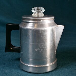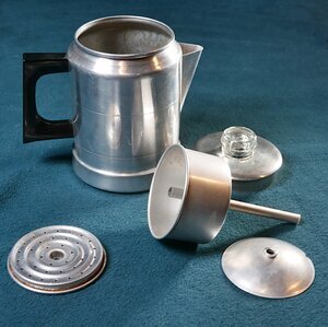 Perkolator (auch Percolator; vom lateinischen 'percolare', übersetzt: 'filtern'), umgangssprachlich auch Dröppelminna genannt des US-Amerikanischen Herstellers Comet in einer Größe für etwa 5 Kaffeetassen. Der Perkulator besteht aus einem zylindrischen Gefäß mit einem abnehmbaren Deckel mit einem Knauf aus durchsichtigem Kunststoff. In dem Behälrter befindet sich lose ein Steigrohr mit einer unten liegenden Auffangkalotte und oben einem zwischen zwei Sieben befindlichem Behälter für den gemahlenen Kaffee. An der Seitenwand befinden sich Markierungen für drei und fünf Tassen Kaffee. Außen am Boden des Behälters befindet sich das Kometen-Logo des Herstellers mit der Inschrift "COMET". Darunter ist der Schriftzug "The popular ALUMINIUM Made in U.S.A.". Leider sind keine Informationen zum Produktionszeitpunkt zu sehen. Wird das Gerät von unten z.B. von einem Gasbrenner erhitzt, so wird das Wasser in der Heizmulde erhitzt. Durch eine am unteren Ende des Steigrohrs angebrachte Auffangkalotte werden Dampfblasen aufgefangen. Wie bei einer Mammutpumpte steigen die Wasserdampfblasen zusammen mit Wassertröpfchen nach oben. Das Ansaugrohr durchstößt den Behälter mit dem Kaffeepulver und endet erst kurz unter dem Glasdeckel. Der Wasserdampf mit seinen Wassertröpfchen spritzt dort gegen den Deckel, kondensiert dort. Es landet auf dem oberen Sieb und wird damit über das Kaffeemehl verteilt. Vom Kaffeebehälter tropft von oben wieder in den unteren, großen Behälter. Im Laufe der Zeit wird das ganze Wasser aus dem Behälter einmal hochgedrückt und durchläuft den Behälter mit dem Kaffeepulver. Der fertige Kaffee kann nun ausgegossen und in Kaffeetassen gefüllt werden. Je länger dieser Brühvorgang dauert, desto stärker wird der Kaffee.