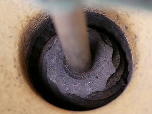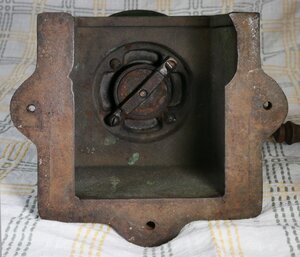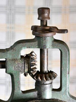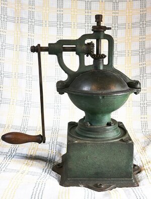 Große dunkelgrüne gusseiserne und obergriffige Kaffeemühle für den gewerblichen Gebrauch. Die Mühle besteht aus zwei gusseisernen Schalen, einer darunterliegenden Schublade und der Mechanik zum Antrieb des Mahlwerks mit der Kurbel. Die Mahlgradeinstellung befindet sich am oberen Ende der Antriebsachse des Mahlwerks. Die zu mahlenden Kaffeebohnen werden in die untere der beiden Schalen gefüllt. An deren unterem Ende befindet sich das Mahlwerk der Kegelmühle. Der gemahlene Kaffee fällt danach in die darunterliegende Schublade und kann dort entnommen werden. An der Frontseite der Schublade befindet sich eine grün überstrichene Plakette. Der obere Schriftzug ist leider nicht mehr lesbar, kann aber durch Vergleiche auf "PATENTAMTL. GESCHÜTZT" rekonstruiert werden. In der Mitte ist der Schriftzug "Pe De" (für Peter Dienes) Das Hirschloge in der Mitte ist ganz schwach zu erkennen. Unter diesem steht der Schriftzug "GESCHMIEDET WERK". Keine Infos zum Herstellungsdatum. Anmerkung: Leider konnte bei einer Recherche im depatisnet des Deutschen Patentamts kein hierzu passendes Patent gefunden werden. Oben auf den Ecken des Metallkästchens das die Schublade umschließ befinden sich in einem Kreis eingeschlossen die Buchstaben P, D, R, 2 . P dürfte für Peter, D für Dienes, R für Remscheid und 2 vielleicht für Modell 2 stehen. Die Mühle entspricht weitestgehend der "Dienes Ladenmühle Nr. 571 von ca. 1920" auf https://www.old-coffee-grinders.com . Im Unterschied zu dieser besitzt unsere Mühle eine Kurbel und kein Schwungrad. Außerdem ist die Kurbel durch Unterschiede in der Mechanik etwas weiter draußen angebracht. Nahezu baugleich ist in unserem Sammlung die Mühle mit der Inventarnummer HR 203.