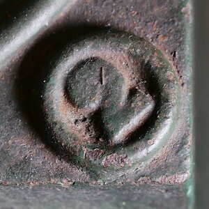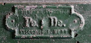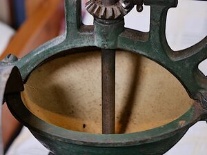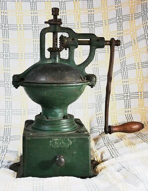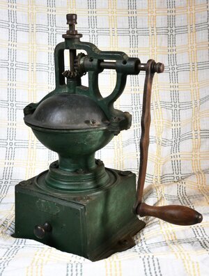 Große dunkelgrüne gusseiserne und obergriffige Kaffeemühle für den gewerblichen Gebrauch. Die Mühle besteht aus zwei gusseisernen Schalen, einer darunterliegenden Schublade und der Mechanik zum Antrieb des Mahlwerks mit der Kurbel. Die Mahlgradeinstellung befindet sich am oberen Ende der Antriebsachse des Mahlwerks. Die zu mahlenden Kaffeebohnen werden in die untere der beiden Schalen gefüllt. An deren unterem Ende befindet sich das Mahlwerk der Kegelmühle. Der gemahlene Kaffee fällt danach in die darunterliegende Schublade und kann dort entnommen werden. An der Frontseite der Schublade befindet sich eine grün überstrichene Plakette. Der obere Schriftzug ist leider nicht mehr lesbar, kann aber durch Vergleiche auf "PATENTAMTL. GESCHÜTZT" rekonstruiert werden. In der Mitte ist der Schriftzug "Pe De" (für Peter Dienes) Das Hirschloge in der Mitte ist ganz schwach zu erkennen. Unter diesem steht der Schriftzug "GESCHMIEDET WERK". Keine Infos zum Herstellungsdatum. Anmerkung: Leider konnte bei einer Recherche im depatisnet des Deutschen Patentamts kein hierzu passendes Patent gefunden werden. Oben auf den Ecken des Metallkästchens das die Schublade umschließ befinden sich in einem Kreis eingeschlossen die Buchstaben P, D, R, 2 . P dürfte für Peter, D für Dienes, R für Remscheid und 2 vielleicht für Modell 2 stehen. Die Mühle entspricht weitestgehend der "Dienes Ladenmühle Nr. 571 von ca. 1920" auf https://www.old-coffee-grinders.com . Im Unterschied zu dieser besitzt unsere Mühle eine Kurbel und kein Schwungrad. Außerdem ist die Kurbel durch Unterschiede in der Mechanik etwas weiter draußen angebracht. Nahezu baugleich ist in unserem Sammlung die Mühle mit der Inventarnummer HR 203.