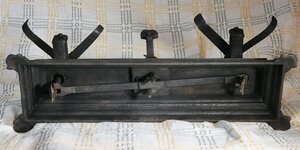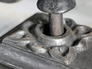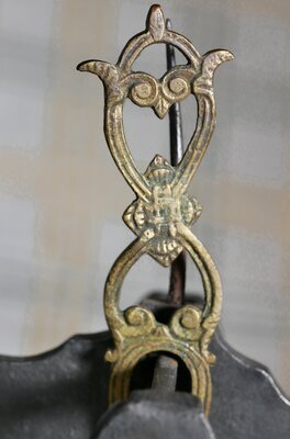 Tafelwaage (Balkenwaage, Zeigerwaage) nach dem System Roberval. Vereinfacht gesagt, wird hier eine Balkenwaage durch einen zweiten Balken unterhalb des ersten Balkens ergänzt. Dieser bewirkt, dass das Moment am Waagebalken von der genauen Position der Gewichte auf der Schale unabhängig ist. Die Waage besteht aus dem Corpus und dem Gestänge. Die Waagschalen und Gewichte sind abgängig. Der Corpus ist im Stil des Historismus gestaltet. Er ist kanneliert und steht auf 4 Füßen mit Blattverzierungen. Auf dem Körper steht in erhabener Schrift " FORGE . 5 KILOG." Die beiden Löcher des Gestänges sind mit jeweils 4 Herzen verziert. Mit einem Zeiger in der Mitte des Gehäuses kann abgelesen werden, ob die Waage sich im Gleichgewicht befindet. Der Körper der Waage ist mit schwarzer Farbe überzogen. Diese zeigt Abrieb an mehrere Stellen. Leider finden sich keine Hinweise auf den (französischen) Hersteller.
