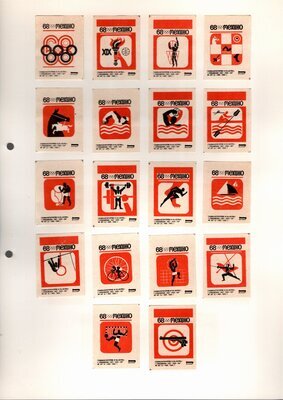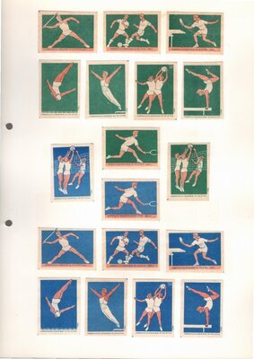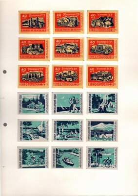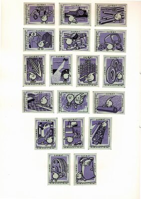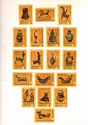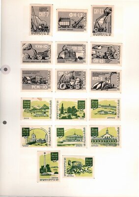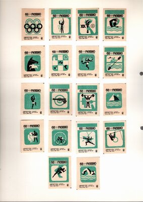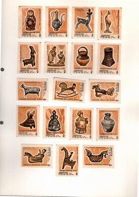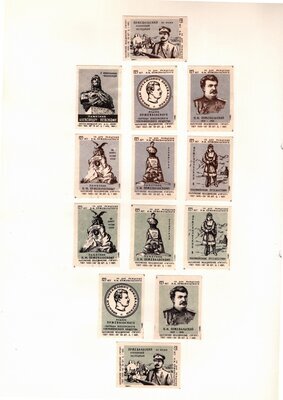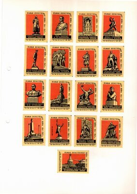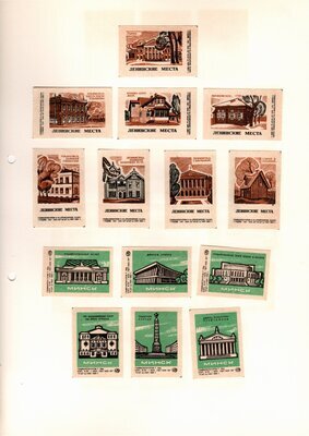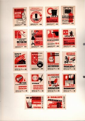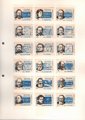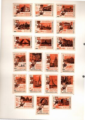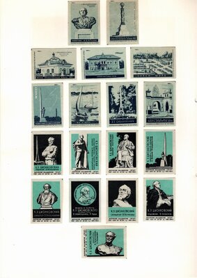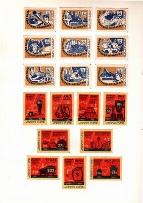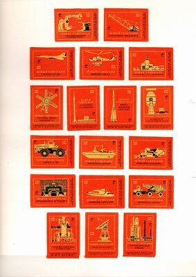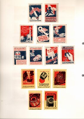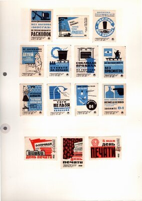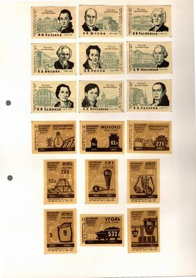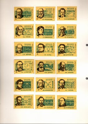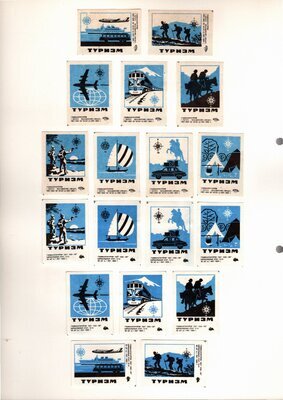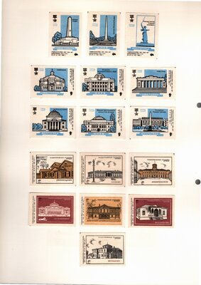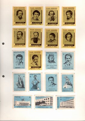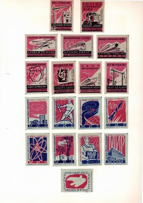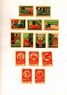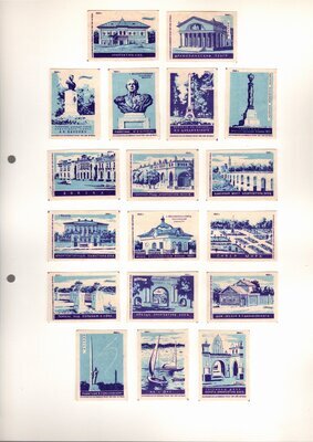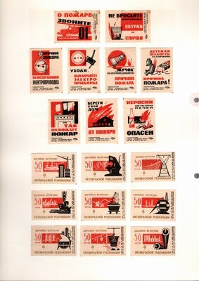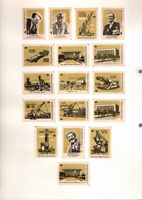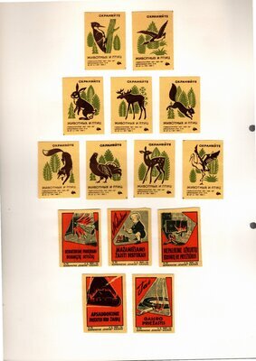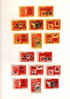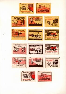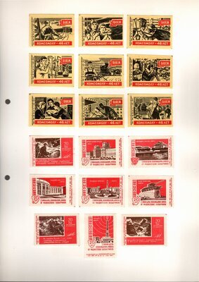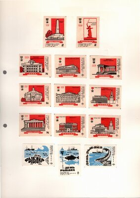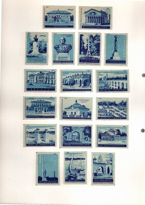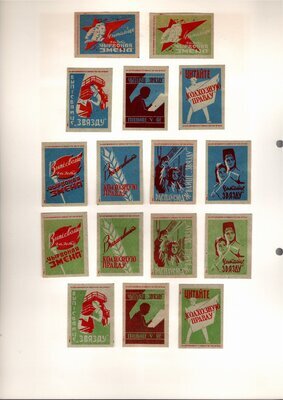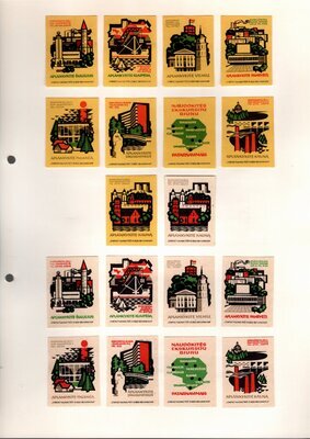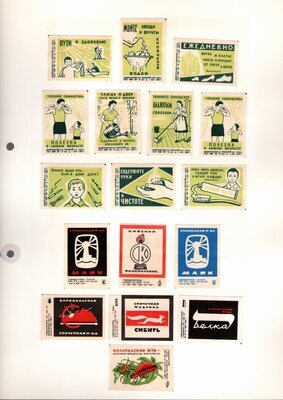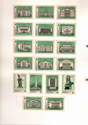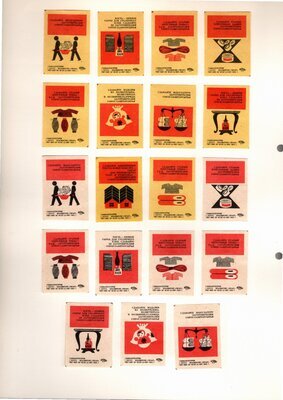 Konvolut von Etiketten für Streichholzschachteln aus der früheren Sowjetunion. Weiterführende Informationen über den Inhalt oder Bedeutung der Etiketten liegen nicht vor. Anhand der Grafiken kann man aber erkennen, dass in der Sowjetunion auch gerne Serien wie in Westeuropa verbreitet wurden: Sport, berühmte Personen und Bauwerke, Trachten, Wappen, Freizeitgestaltung und ähnliches. Teilweise wurden die Serien in verschiedenen Farbgebungen herausgegeben. Eine Serie wurde anlässlich der Olympischen Spiele 1968 herausgegeben, vermutlich stammen alle Etiketten aus den 1960er Jahren. Der gute Zustand und dass die Serien anscheinend Vollständig sind, führt zur Vermutung, dass die hier vorhandenen Etiketten nie auf Zündholzschachtel geklebt waren, sondern gezielt als Sammlerware exportiert wurden.