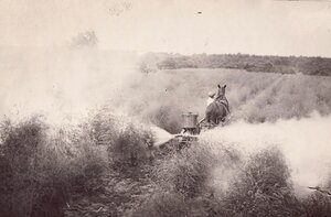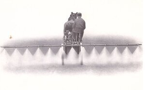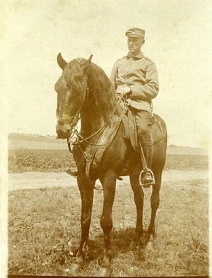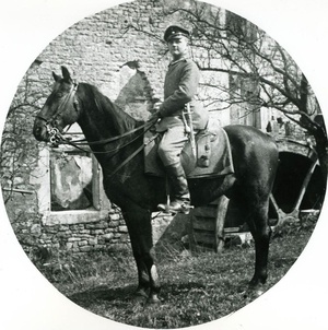 Die schwarzweiß Fotoabzug zeigt eine nostalgische Szene aus der Vergangenheit. Eine junge Frau reitet auf einem Pferd und sitz in einem Damensattel. Das Pferd ist groß, mit einem hellen Fell und einer dunklen Mähne, und es steht auf einem schmalen Pfad aus Erde. Im Hintergrund sind Bäume, grasbewachsene Flächen und ein Gebäude zu sehen.