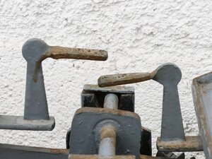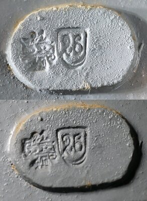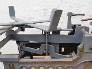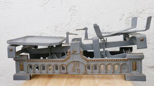 Einfache Tafelwaage für 10 kg Maximalgewicht nach dem Konstruktionsprinzip von Joseph Béranger.. Eine Tafelwaage unterscheidet sich von einer einfachen Balkenwaage durch das Gestänge im Inneren. Dieses bewirkt, dass das Moment am Waagebalken von der Position der Gewichte auf der Schale unabhängig ist. Auch werden Schrägstellung als auch Standortbewegungen bei der Béranger-Waage besser kompensiert, was die Nutzungsmöglichkeiten der Tafelwaage wesentlich erweitert. Bei einer Schnabelwaage sind die beiden Schnäbel auf eine Höhe zu bringen, damit die Waage im Gleichgewicht steht. Die Waage besitzt auf der einen Seite eine Halterung für eine Waagschale und auf der anderen Seite eine ebene Fläche für die Gewichte. Sie zeigt auf Vorder- und Rückseite in der Mitte den Schriftzug "10 kg" für die maximale Belastung der Waage. Die Waage ist mittelgrau lackiert. Verschiedene Zierelemente werden durch eine Lackierung mit Goldbronze hervorgehoben. Der gusseiserne Rahmen ist durchbrochen. Neben ästhetischen Gründen wohl auch zur Gewichtseinsparung. Am Waagebalken befindet sich auf der einen Seite die Punze 10 kg und auf der anderen Seite sehr klein und sehr schlecht lesbar der Eichstempel "21 DR 40" und daneben im Wappenschild die "26". Beide Fotos zeigen den gleichen Stempel mit unterschiedlicher Lichtsetzung "21" steht für den Aufsichtsbezirk Karlsruhe Die untere Zahl sieht auf den ersten Blick aus wie eine 10. "10" wäre das Gemeindefasseichamt Gottmadingen. Dort wurden aber, wie der Name es vermuten lässt, nur Fässer und Herbstgefäße geeicht. Die erste Zahl könnte auch eine 4 sein. Dann stünde "40" steht für das Eichamt Konstanz, wobei dieses ab 1914 die Ordnungszahl "1"hatte. Vielleicht hatte sich der damalige Mitarbeiter die Arbeit des Umstempelns nicht machen wollen. 26 im Wappenschild bedeutet die Eichung war wurde 1924 durchgeführt und was bis 1926 gültig. Danach wurde sie wohl nicht mehr gewerbsmäßig, sondern als Küchenwaage genutzt. Keine Hinweise auf den Hersteller. Wir bedanken uns beim Landesamt für Mess- und Eichwesen Rheinland-Pfalz für die Informationen zum Eichwesen.