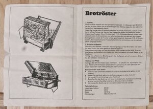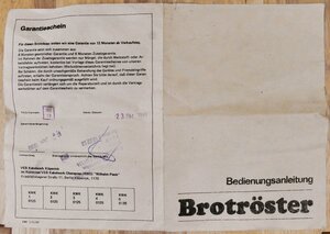 Ein Toaster (ehemals und in der DDR Brotröster genannt) ist ein elektrischer Apparat zum Rösten von Brot, insbesondere von Toastbrot. Das vorliegende Gerät aus der Produktion des Kabelwerks Köpenick wurde für 29,-- Mark (der DDR) angeboten und ist zusammen mit der Originalverpackung, dem ausgefüllten Garantieschein, einer Gebrauchanweisung und der Liste von Kundendienstvertragswerkstääten erhalten. Das Kabelwerk Köpenick unterstand dem VEB Kabelwerk Oberspree. Das konkrete Exemplar besitzt zum Anschluss an das Stromnetz eine Buchse für einen Bügeleisenstecker und benötigt einen Stromanschluss mit 220 V. Die Leistungsaufnahme ist 400W. Auf der gegenüberliegenden Seite befindet sich ein Schalter aus Kunststoff. Das Gerät besteht aus einem Standteil mit eingebauten Heizstäben in der Mitte und auf beiden Längsseiten einer die ganze Seite umschließende Klappe. Auf der Unterseite des Geräts befinden sich 2 Typenschilder. Eine auch mit dem Firmenlogo. Der Toaster eignet sich zum Toasten von Brotscheiben und zum Aufbacken von Brötchen: Zum Brottoasten werden die beiden Klappen geöffnet und je ein Stück Brot in diese eingelegt. Nach maximal 2 Minuten wird die Klappe geöffnet, das Brot gewendet und von der anderen Seite die gleiche Zeit gebacken. Zum Aufbacken von Brötchen wird das Gerät der Länge nach auf den beiliegenden Ständer gestellt, die (obere) Klappe geöffnet und die Brötchen auf dem Gitter über den freiliegenden Heizstäben erhitzt.