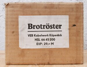 Ein Toaster (ehemals und in der DDR Brotröster genannt) ist ein elektrischer Apparat zum Rösten von Brot, insbesondere von Toastbrot. Das vorliegende Gerät aus der Produktion des Kabelwerks Köpenick wurde für 29,-- Mark (der DDR) angeboten und ist zusammen mit der Originalverpackung, dem ausgefüllten Garantieschein, einer Gebrauchanweisung und der Liste von Kundendienstvertragswerkstääten erhalten. Das Kabelwerk Köpenick unterstand dem VEB Kabelwerk Oberspree. Das konkrete Exemplar besitzt zum Anschluss an das Stromnetz eine Buchse für einen Bügeleisenstecker und benötigt einen Stromanschluss mit 220 V. Die Leistungsaufnahme ist 400W. Auf der gegenüberliegenden Seite befindet sich ein Schalter aus Kunststoff. Das Gerät besteht aus einem Standteil mit eingebauten Heizstäben in der Mitte und auf beiden Längsseiten einer die ganze Seite umschließende Klappe. Auf der Unterseite des Geräts befinden sich 2 Typenschilder. Eine auch mit dem Firmenlogo. Der Toaster eignet sich zum Toasten von Brotscheiben und zum Aufbacken von Brötchen: Zum Brottoasten werden die beiden Klappen geöffnet und je ein Stück Brot in diese eingelegt. Nach maximal 2 Minuten wird die Klappe geöffnet, das Brot gewendet und von der anderen Seite die gleiche Zeit gebacken. Zum Aufbacken von Brötchen wird das Gerät der Länge nach auf den beiliegenden Ständer gestellt, die (obere) Klappe geöffnet und die Brötchen auf dem Gitter über den freiliegenden Heizstäben erhitzt.