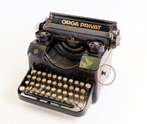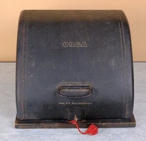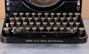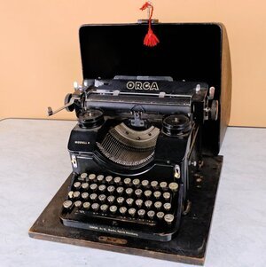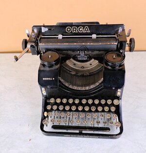 Unsere ORGA Mod. 9 wurde ca. 1939 hergestellt. Auf dem schwarzen Lack prangt in großen, goldfarbenen Buchstaben der Name: ORGA , darunter, unterhalb der linken Farbbandrolle die Bezeichnung "Modell 9". Die Maschine verfügt über eine reichhaltige Ausstattung. Dazu gehören der Wagenfreilauf, Randsteller rechts und links, Feststeller für die Umschaltung, Rücktaste, Farbbandumschalter und die deutschen QWERT Tastatur. Technisch gesehen ist es eine Typenhebelmaschine mit Wagnergetriebe und Wagenumschaltung.