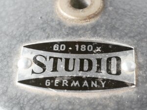 Ein sehr kleine Mikroskop des Herstellers Eschenbach Optik, Nürnberg. Modell Studio 60-180x. Es ist ein sehr einfaches Mikroskop mit nur einem Objektv, wie es typischerweise in Schulen für Mikroskopiekurse vorgehalten wurde. Das Mikroskop besteht aus einem metallgrauen Ständer, einem Tischchen für das Präparat und einer Metallröhre in der unten das Objektiv angeschraubt ist. Das Okular fehlt. Ebenso das Transportkästen, die Bedienungsanleitung und das Zubehör.