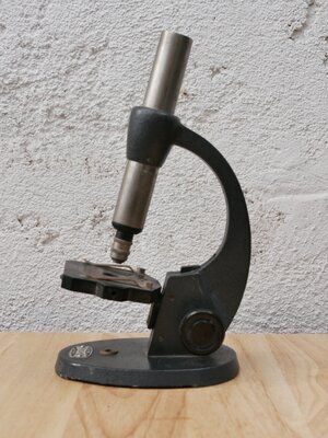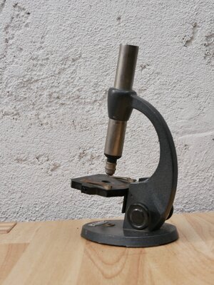 Ein sehr kleine Mikroskop des Herstellers Eschenbach Optik, Nürnberg. Modell Studio 60-180x. Es ist ein sehr einfaches Mikroskop mit nur einem Objektv, wie es typischerweise in Schulen für Mikroskopiekurse vorgehalten wurde. Das Mikroskop besteht aus einem metallgrauen Ständer, einem Tischchen für das Präparat und einer Metallröhre in der unten das Objektiv angeschraubt ist. Das Okular fehlt. Ebenso das Transportkästen, die Bedienungsanleitung und das Zubehör.