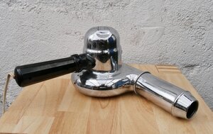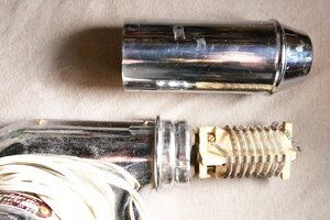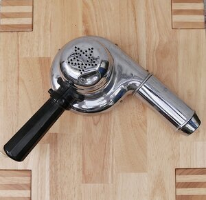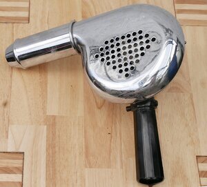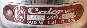 Der Föhn Calor des Herstellers Apel ist aus verchromten Blech mit einem Bakelitgriff gefertigt. Im Zentrum des Geräts steht das Gebläse, das in dem runden Mittelteil beheimatet ist. Rechts ist an diesem der im Vergleich zu heutigen Geräten sehr großer Motor befestigt. Durch Löcher auf beiden Seiten - d.h. am Gebläse und am Motor - wird Luft eingesaugt und durch die sehr lange Düse wieder ausgeblasen. In der Düse sind offen die Heizdrähte angebracht durch die die austretende Luft geblasen wird. An deren Spitze der Düse wird die Luft dann wieder ausgeblasen. Der schwarze Griff aus Bakelit ist am Motorgehäuse angeschraubt. Ein Schiebeschalter, mit dem der Föhn ein- und ausgeschaltet werden kann, durchstößt den obersten Bereich des Griffs. Die Informationen auf dem Typenschild sind: APEL USE (plus dem Firmenlogo dazwischen) Calor 50~ (Calor ist der Produktname, letzteres ist das Symbol für 50Hz Wechselstrom) 120 V Série 4-58 330 W cat. no 905 Aufgrund des Typenschilds (und des Akzents auf den é) ist der Föhn als französisches Fabrikat erkennbar. Leider war nichts über den Hersteller Apel (oder die Marke) herauszufinden. Zur Zeit der Inventarisierung (April 2024) wurden auf diversen Plattformen (ebay, etsy, kleinanzeigen.de ricardo.ch, ...) mehrere vergleichbare Geräte angeboten. Die Datierung der einzelnen Geräte lag im Bereich der 1950er bis 1980er Jahre. Alle hatten (soweit lesbar) für die notwendige Netz-Stromspannung 120 V angegeben, was auf ein eher früheres Produktionsdatum hindeutet. Sucht man mit französischsprachigen Suchbegriffen. so erhält man deutlich mehr Treffer: Einige (wenige) mit 220V oder 225V und einige bei denen die Voltzahl mit 220V überklebt ist. Da in Frankreich erst Anfang der 1960er Jahre die Stromspannung von 110V auf 220V umgestellt wurde, ist ein Herstellungsdatum in den (späten) 1950er-Jahren anzunehmen.